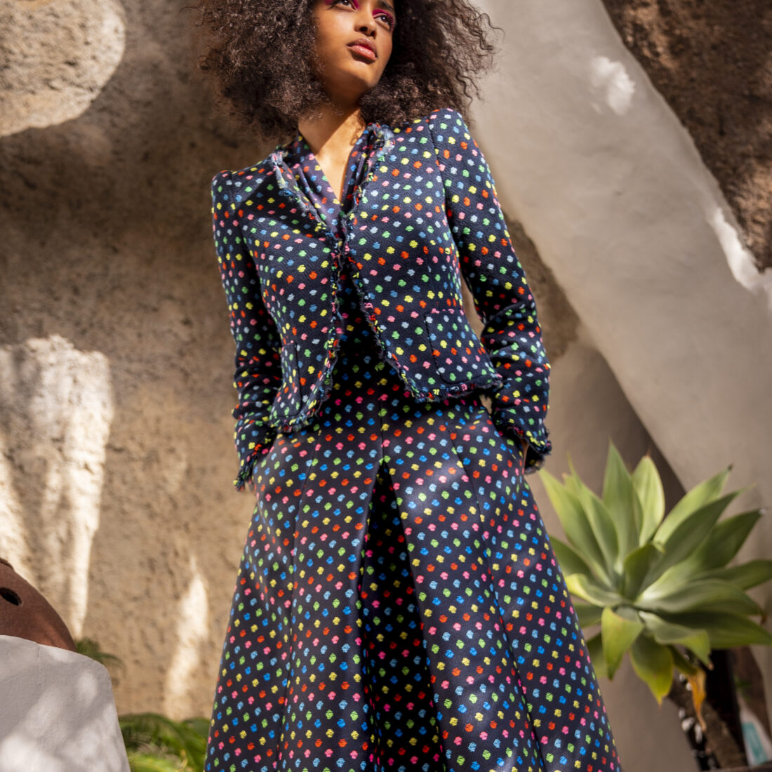 As I began working with Linton’s tweeds, my design process shifted. Their fabrics have this rare blend of tradition and playfulness—structured enough to shape a garment with confidence, yet full of personality and movement. Designing with them felt like a conversation between the fabric and my ideas, a push-and-pull that opened up new possibilities. Instead of forcing a concept, I found myself letting the material guide me.